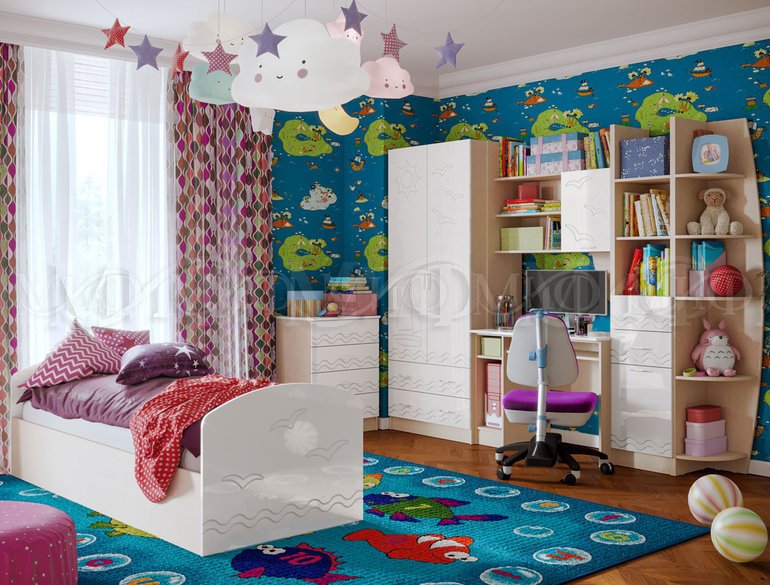 Набор необходимой детской мебели. Размеры:Стенка (2550*2000*520),Комод (600*820*430), Кровать (840*650*2030).Варианты исполнения:матовая: белая, ваниль, оранж, салат, синяя, сиреневая;металл: ваниль глянец, розовый глянецголубой, оранж, салат, синяя, сире